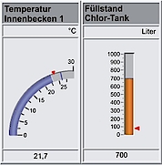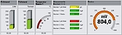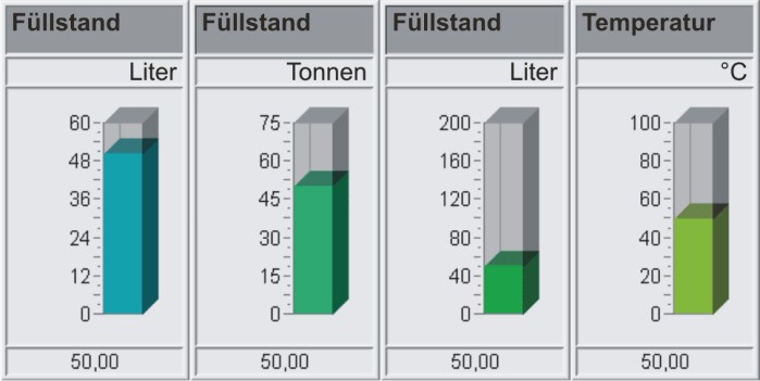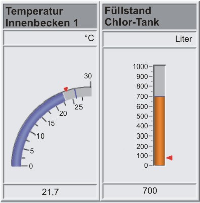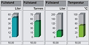 - Darstellung des Analog-Instruments ist wahlweise mit oder ohne Schleppzeiger für die Min/Max-Werte möglich; die Werteangaben sind absolut oder prozentual darstellbar