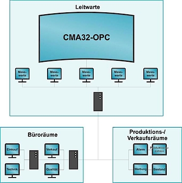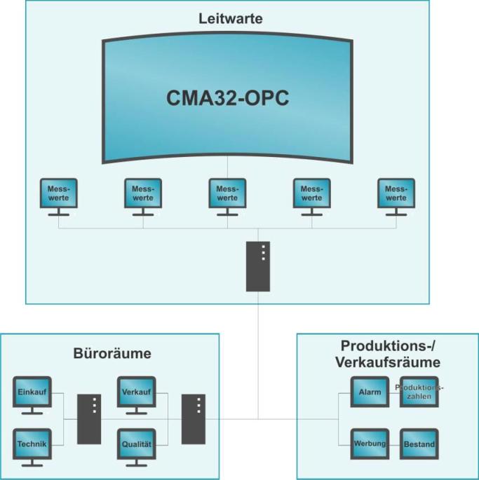 Bei einer zu hohen Anzahl an Messwerten können Sie sich mit CMA32-OPC diese auf mehreren Bildschirmen oder auf einer Videowand anzeigen lassen. Ein zentraler PC verwaltet dabei alle Messdaten und steuert die Anzeige auf mehreren direkt angeschlossen Bildschirmen, die auch räumlich getrennt aufgestellt werden können. So haben Sie jederzeit all ihre Daten im Blick, ohne Platzprobleme, ohne ständiges Wechseln der Anzeigen. Der Anschluss der dafür benötigten PC‘s, sowie Konfiguration der PC’s erfolgt individuell nach den jeweiligen Kundenvorgaben. Gerne beraten wir Sie bei der Wahl der Komponenten zur optimalen Verwirklichung ihrer Wünsche.