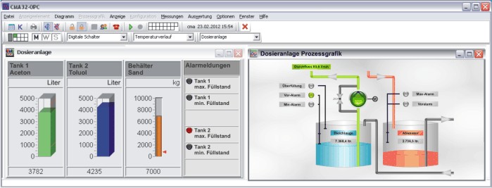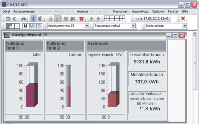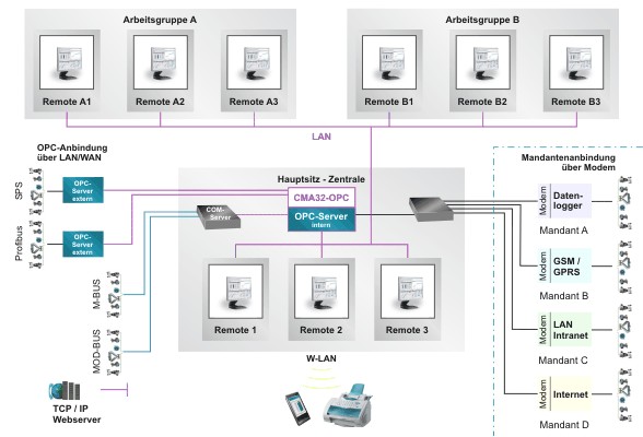 Die Übertragung von Messwerten eines am Messort befindlichen Messfühlers (Sensors) zu einer räumlich getrennten Stelle ist ein weiteres Feature von CMA32-OPC. Die Messwerte werden an der Empfangsstelle direkt gesammelt, aufgezeichnet und ausgewertet. Auch ein direktes Eingreifen ist möglich durch die Steuerung die CMA32-OPC bietet.