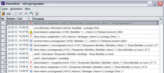 - alle aufgetretenen Kontroll- bzw. Warnalarme werden in einer Alarmdatei protokolliert, auch die Rücksetzung des Alarms sowie die Bestätigung mit entsprechenden Bearbeiterkurzzeichen wird erfasst
