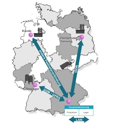 - eine Mandantenanbindung (z. B. Kunden, Fernlager, Filialen ohne Netzwerkanbindung) mit Datenfernübertragung via Modem ist optional verfügbar und kann auch nachträglich eingebunden werden